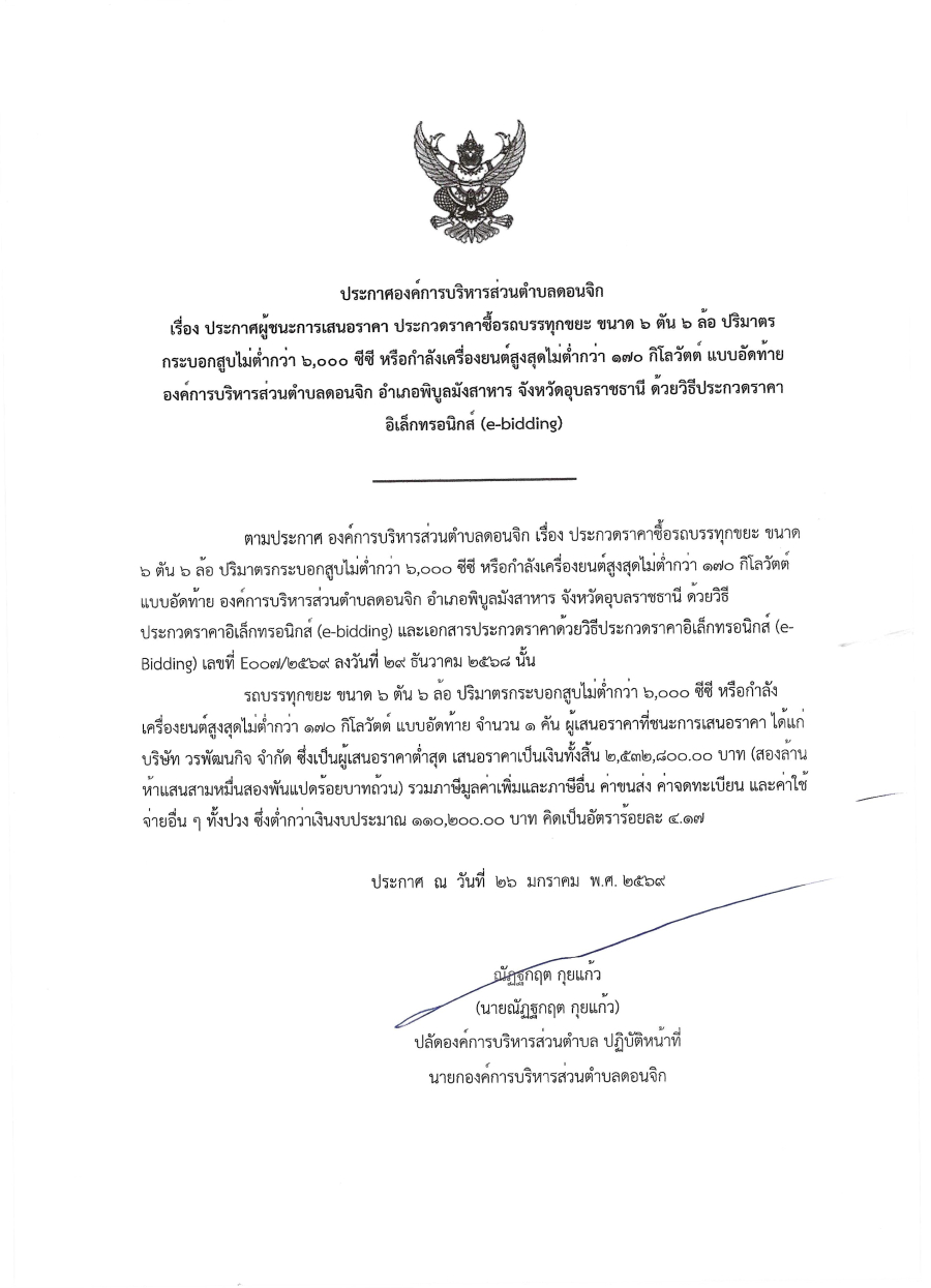 ประกาศผู้ชนะการเสนอราคา ประกวดราคาซื้อรถบรรทุกขยะ ขนาด 6 ตัน 6 ล้อ ปริมาตรกระบอกสูบไม่ต่ำกว่า 6,000 ซีซี หรือกำลังเครื่องยนต์สูงสุดไม่ต่ำกว่า 170 กิโลวัตต์ แบบอัดท้าย
